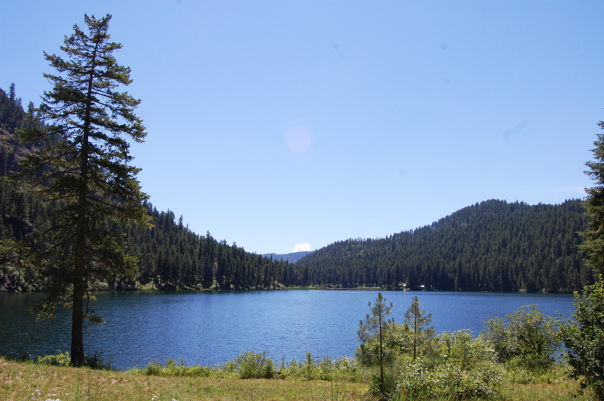 In the Colville National Forest, hidden away, is Pierre Lake campground. It’s hot today, but the lake is inviting – already populated with a few splashing families, and kayaks heading off to some quiet picnic on the far shore (click on the picture to see ’em).