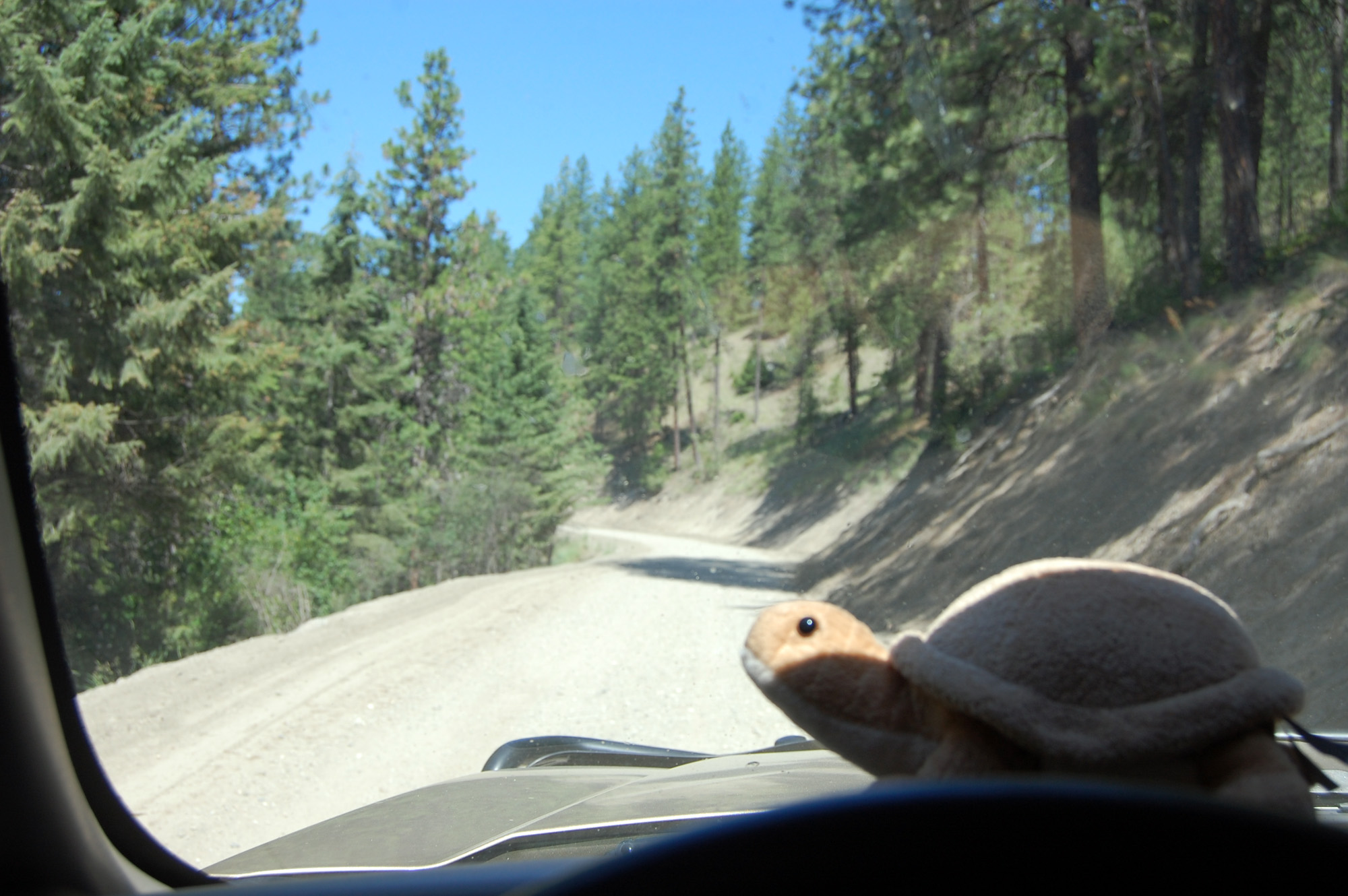 Taking a shortcut from Colville (that’s “call-vul” to ya’all who might be from elsewhere), the trusty GPS leads us up a mountain to a narrowing gravel road.