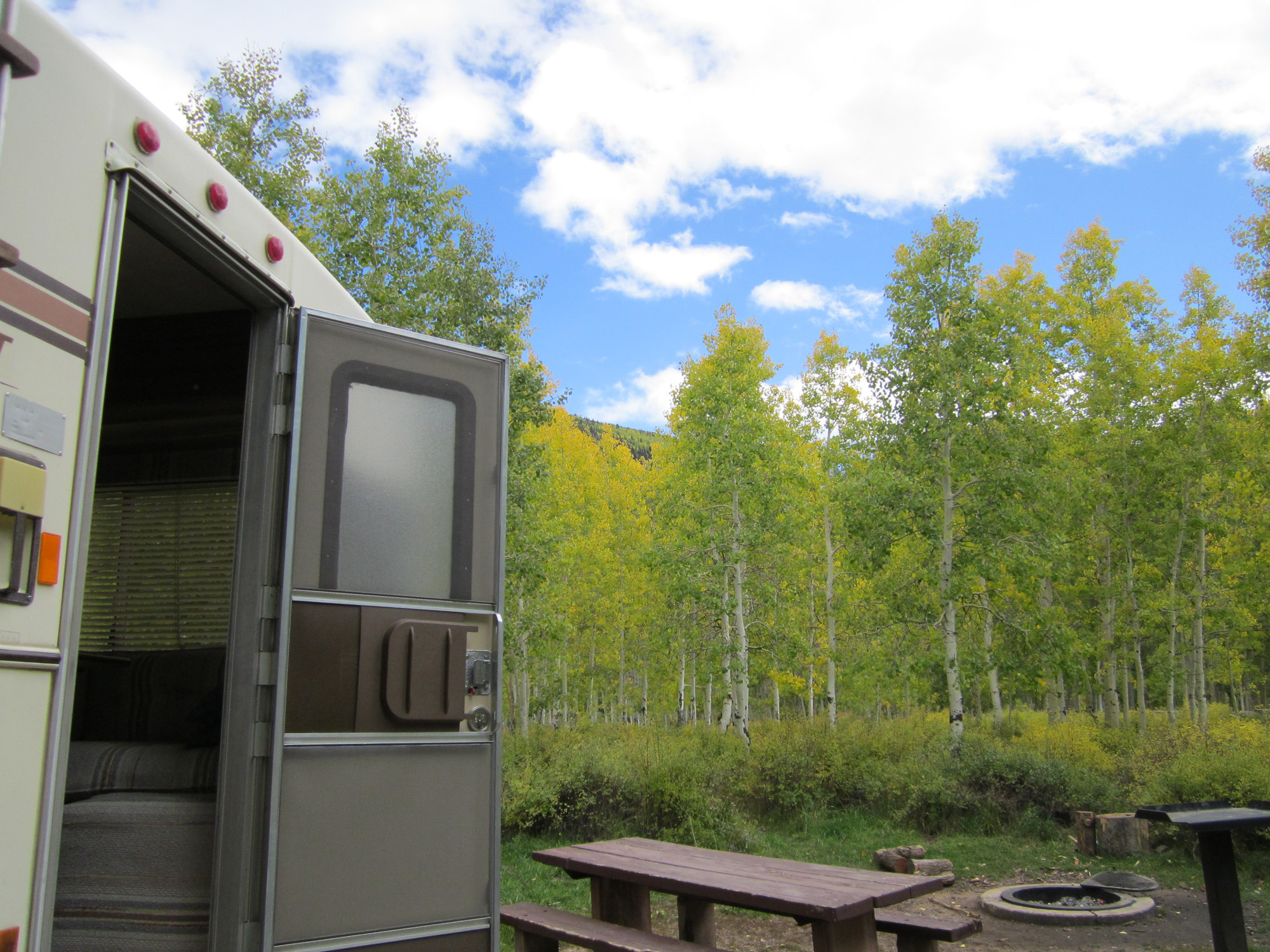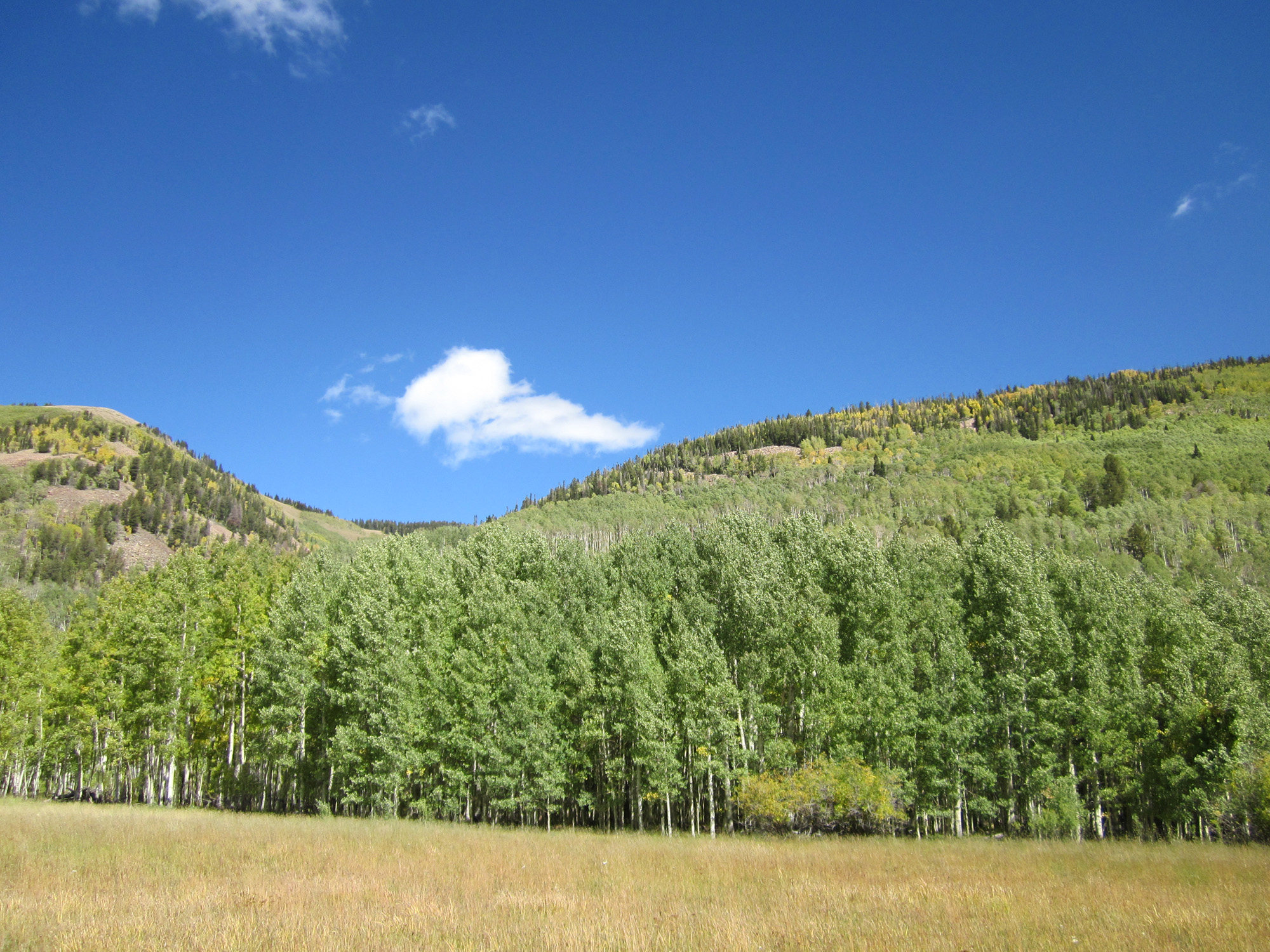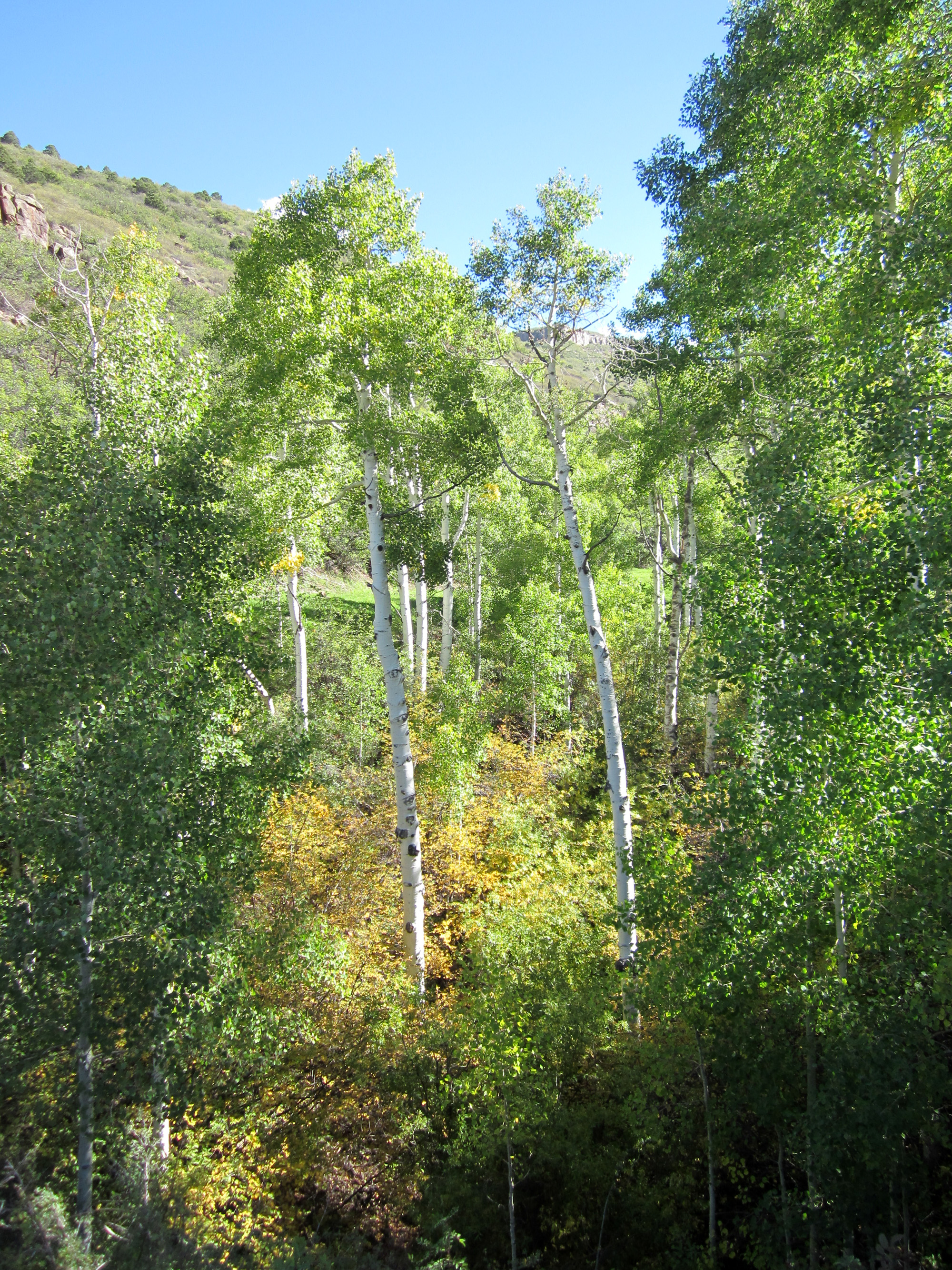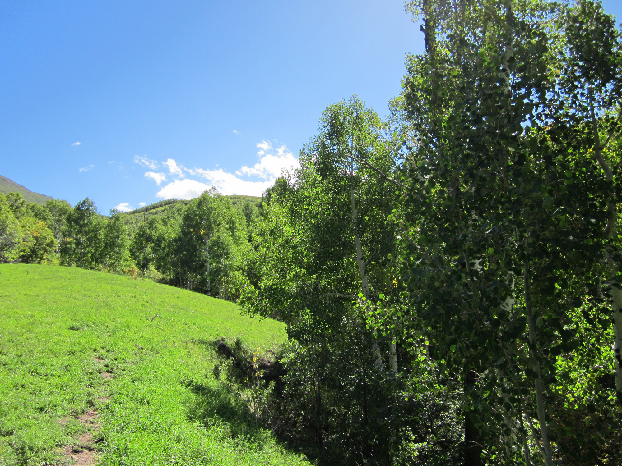 Hidden away, in the back of a little ravine, we could hear the rustling of aspens. And, peering through the leaves we spotted what looked like a green meadow! Time to carefully back down the narrow path, park and throw open the back door. Lunch in the park!