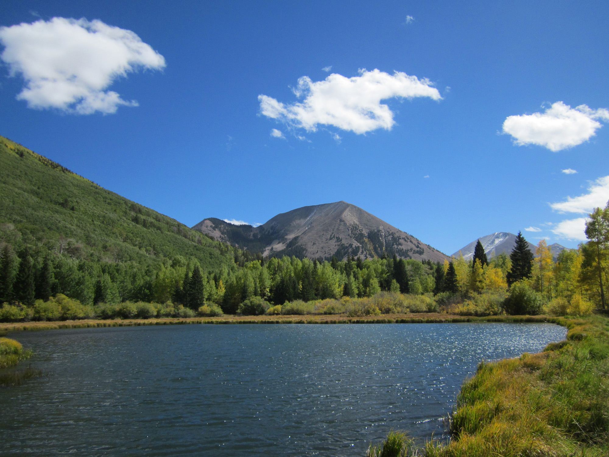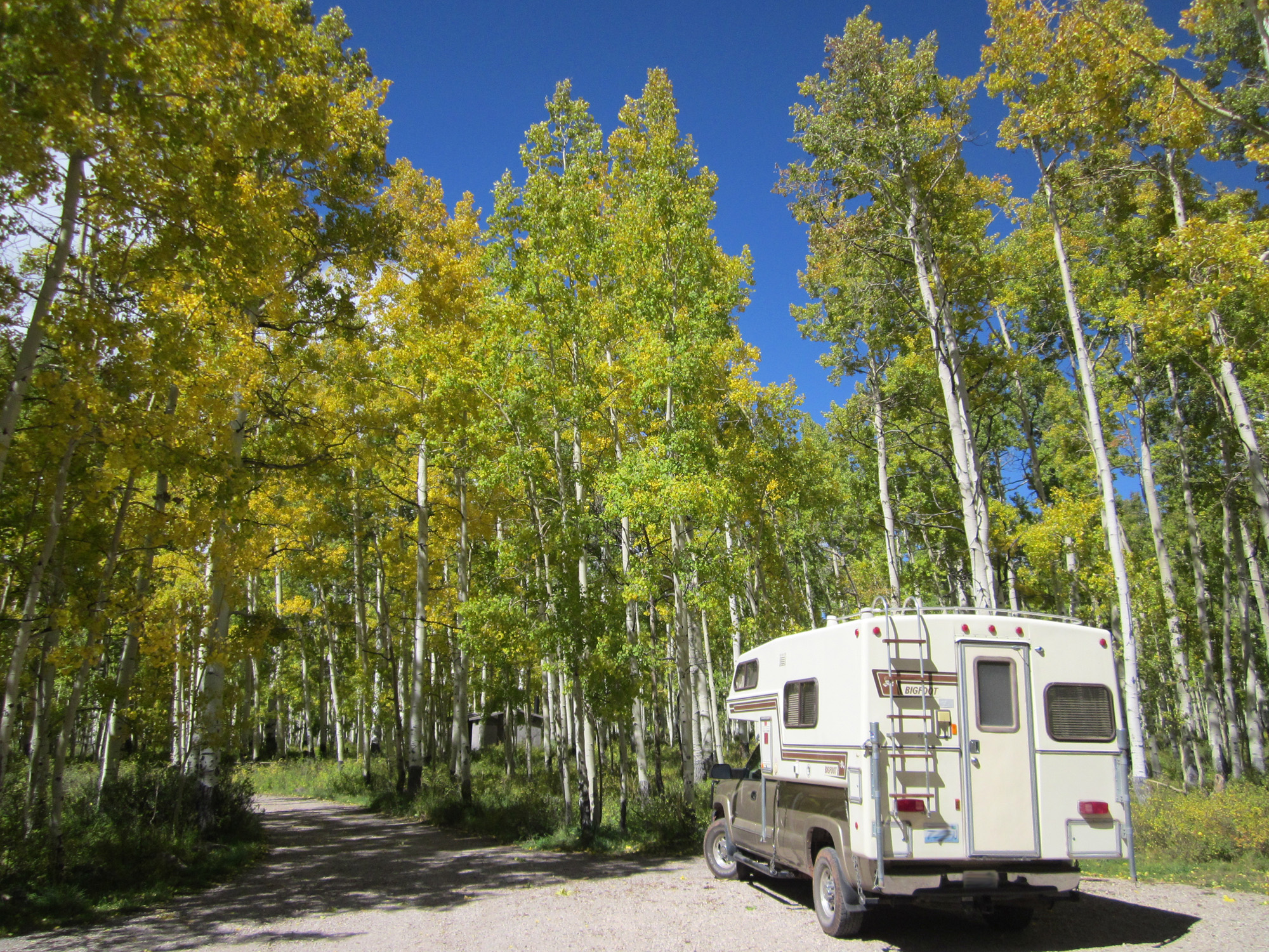 Completely quiet except for the wind rustling up the aspens. They are starting to change color … it’s way cooler up here than down in Moab! Oh … there’s a cyclists path, and a pointer to another lake a few mile off. And … a little ranger cabin.