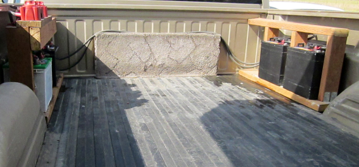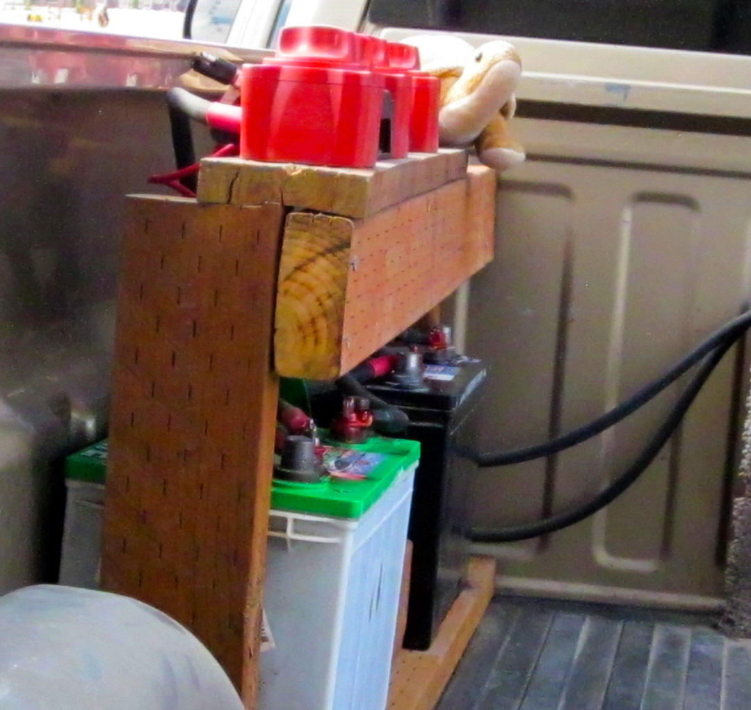 Over here, on the other side of the truck bed, sit a couple of 6V golf cart batteries wired in series (to take the voltage up to 12V). A flip of one of the switches above, and we have access to a bunch more amp-hours! This makes my driver happy!