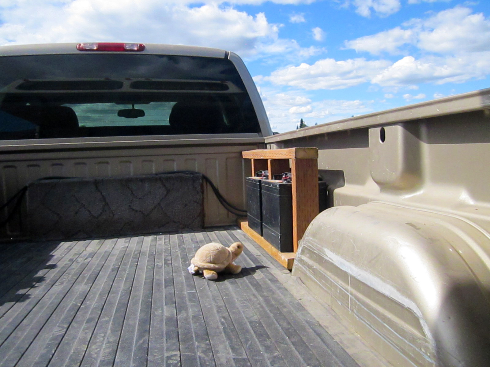 Here’s how they sit in the truck bed … tucked away securely in space that is otherwise unused. All of these add up to approximately 450AH, enough to last a looong time. Happy driver, happy tortuga!