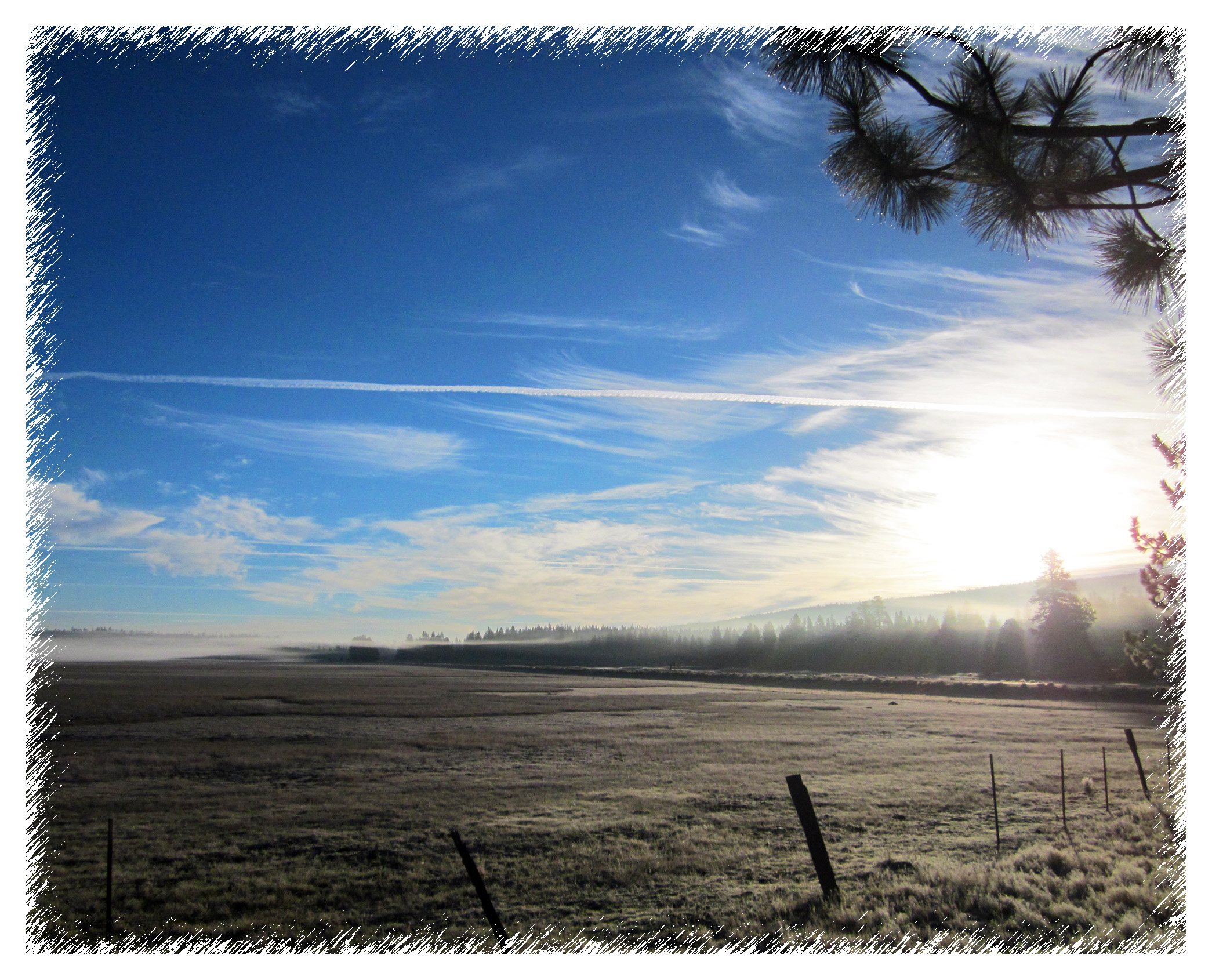 Early in the morning, the sun is coming up … but the temperature is loooow. We’re between a bevy of volcanoes … Whaleback and Miller Mountain, Horse-thief Butte, Deer Mountain (and Little Deer), Goosenest Mountain … but from the temperature, there’s no volcanic activity today!!