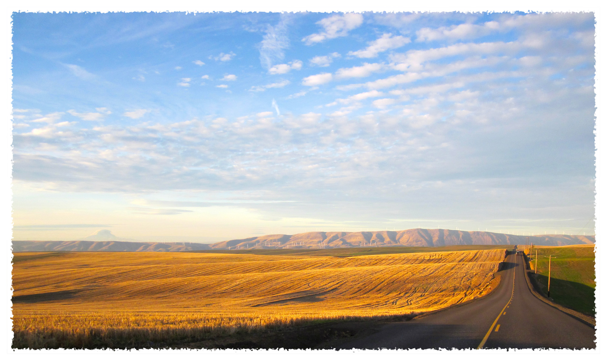 Here we are in the evening hours … great for taking pictures. The mountains in the distance are in Washington, just over the Columbia River. We’re going to take a side road here, through a couple of little towns, and visit a place we missed on our trip down …