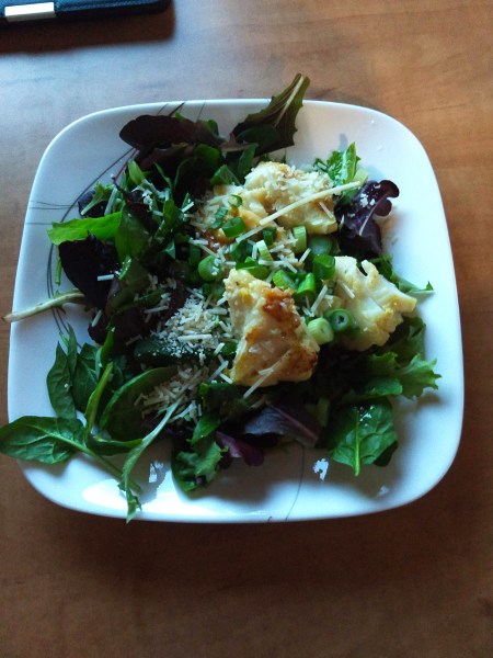 … then a Spring mix of tender young lettuces, radicchio and arugula, topped with fresh wild cod sauteed in butter … a little Parmigiano Reggiano …