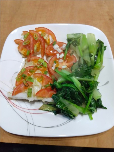 That’s not to say that we’ve been starving … below is baked wild Pacific cod with farm fresh tomatoes and home grown bok choy, cooked in the tiny home.