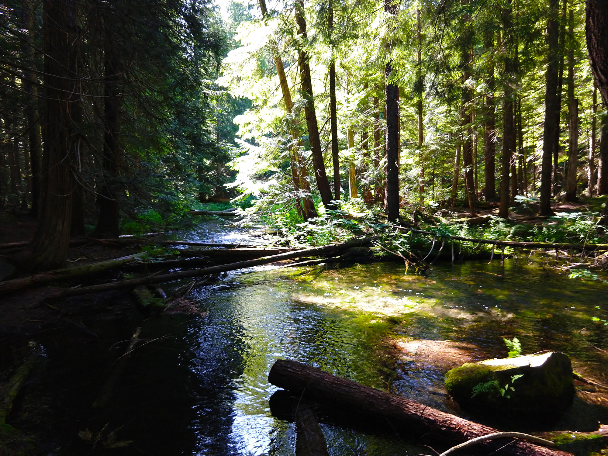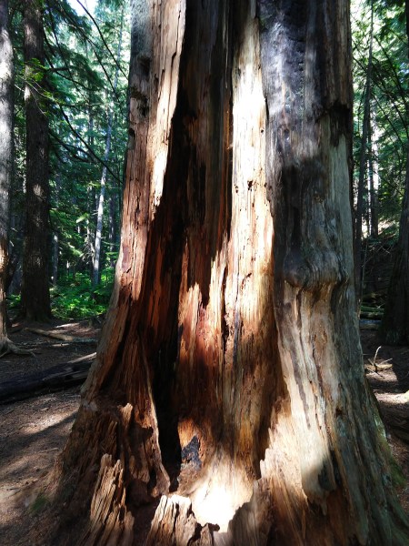 Places to sit back … to listen to the unbroken bubbling of the creek … to mull over the burn marks, hollows, gashes on those giant trees. Places to reflect on early native americans, prospectors, trappers and others who traveled here.