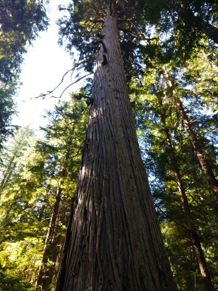 Big trees! Giant Western Red Cedars, some 8 feet in diameter, 175 feet tall. Coupled with shade-loving Western Hemlocks, this small area is humid with very large ferns thriving! Nice.