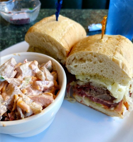 … roast beef, crispy caramelized onions, mushrooms, sliced tomato, cheddar, swiss and bbq sauce on grilled sourdough …