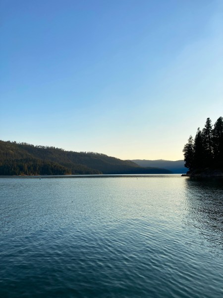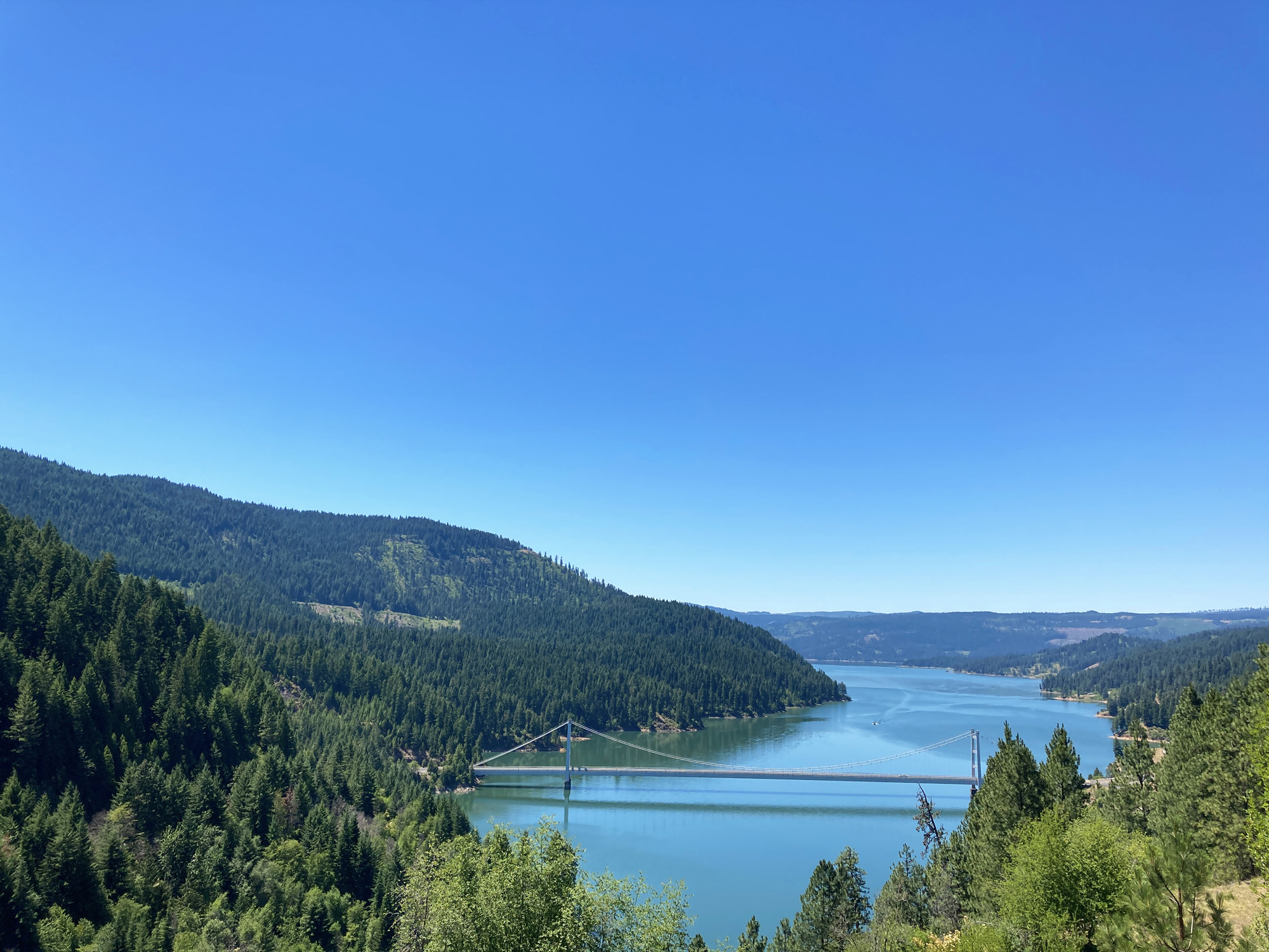 Sheltering trees that keep the noon heat at bay, and a breeze coming off the lake. Promises of welcome relief. We’re 19 miles from the highway up and over the mountains and down some switchbacks going to Dworshak Lake … an uncrowded visual delight. Check your vehicle brakes we’re advised.
