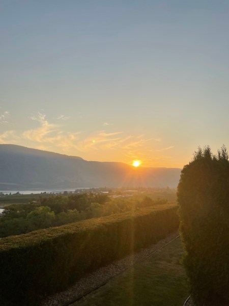 The Pacific Northwest harvest includes plump luscious grapes. Within a few miles of towering mountains, endless forests, expanses of prairies, dry desert, ocean and lakes, lie microclimates suited for wine. The vineyard pictured above is only a short two hours from our evening site, below, on the forested lake.